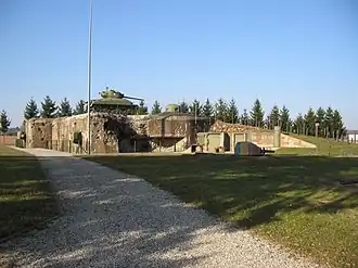 The Esch casemate is a double casemate on one level, designed to fire laterally in either direction along the front, supporting its neighbors to the east and west. The position was armed with two twin heavy machine guns, type JM and, two 47mm anti-tank gun/JM combinations, one of each firing laterally. These embrasures were covered by automatic rifle ports firing across their fronts. A projecting caponier defended the entrance with automatic rifle fire, with an additional firing port to the north. On top of the fort, two GFM cupolas or cloches armed with automatic rifles were situated to fire in all directions.[3] The casemate measures approximately 28 metres (92 ft) by 18 metres (59 ft), and is 7.5 metres (25 ft) high. Concrete thickness varied from 2.5 metres (8.2 ft) at the front to 1-metre (3.3 ft) at the rear.[4] The casemate occupies a small hill, presenting an earth embankment studded with anti-tank rails to the north. Its name is derived from the name of the locale in the Alsatian dialect, signifying a farmer's harrow.[1]