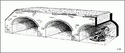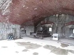 In fortifications designed to resist artillery, a casemate was originally a vaulted chamber usually constructed underneath the rampart. It was intended to be impenetrable and could be used for sheltering troops or stores. With the addition of an embrasure through the scarp face of the rampart, it could be used as a protected gun position.[11] In bastion forts, artillery casemates were sometimes built into the flanks of bastions, but in action they quickly filled with smoke making them inoperable and for that reason, had fallen out of favor during the 17th century.[12]