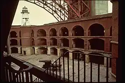 In the late 18th century, Marc René, marquis de Montalembert (1714–1800) experimented with improved casemates for artillery, with ventilation systems that overcame the problem of smoke dispersal found in earlier works. For coastal fortifications, he advocated multi-tiered batteries of guns in masonry casemates, that could bring concentrated fire to bear on passing warships. In 1778, he was commissioned to build a fort on the Île-d'Aix, defending the port of Rochefort, Charente-Maritime. The outbreak of the Anglo-French War forced him to hastily to build his casemated fort from wood but he was able to prove that his well-designed casemates were capable of operating without choking the gunners with smoke.[13] The defenses of the new naval base at Cherbourg were later constructed according to his system.[14] After seeing Montalembert's coastal forts, American engineer Jonathan Williams acquired a translation of his book and took it to the United States, where it inspired the Second and Third Systems of coastal fortification; the first fully developed example being Castle Williams in New York Harbor which was started in 1807.[15][16]