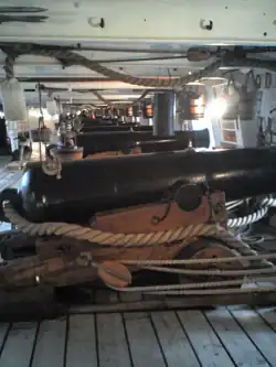 A "casemate" was an armored room in the side of a warship, from which a gun would fire. A typical casemate held a 6-inch gun, and had a 4-to-6-inch (100 to 150 mm) front plate (forming part of the side of the ship), with thinner armor plates on the sides and rear, with a protected top and floor,[31] and weighed about 20 tons (not including the gun and mounting).[32] Casemates were similar in size to turrets; ships carrying them had them in pairs, one on each side of the ship.