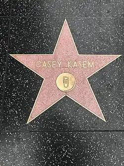 In 1981, Kasem was granted a star on the Hollywood Walk of Fame.[81] He was inducted into the National Association of Broadcasters Hall of Fame radio division in 1985,[82] and the National Radio Hall of Fame in 1992. Five years later, he received the Radio Hall of Fame's first Lifetime Achievement Award.[8] In 2003, Kasem was given the Radio Icon award at the Radio Music Awards.[81]