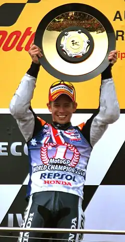 Casey Joel Stoner AM (born 16 October 1985) is an Australian retired professional motorcycle racer, and a two-time MotoGP World Champion, in 2007 and 2011. During his MotoGP career, Stoner raced for the factory teams of Ducati and Honda, winning a title for each team.