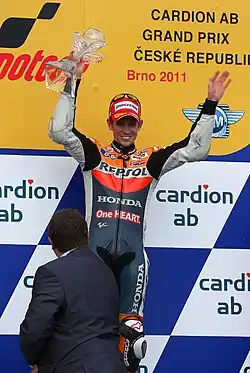 Stoner raced with the Repsol Honda Racing Team in 2011, with teammates Dani Pedrosa and Andrea Dovizioso. In preseason testing in Malaysia, Stoner was quickest in all three sessions,[45] closely followed by Pedrosa and reigning world champion Jorge Lorenzo. Stoner won the season-opening race in Qatar from pole position,[46] and had been quickest in each of the free practice sessions held before qualifying. Stoner took pole position for the Spanish Grand Prix, but had been running second behind Marco Simoncelli in wet conditions. Valentino Rossi attempted an overtake on Stoner from a long way back and crashed, taking him down as well.[47][48] After the race, when Rossi came to his garage to apologise for the incident, Stoner replied with the now-famous line, "Obviously your ambition outweighed your talent.[49] Stoner won three out of the first five rounds of the season, with victories in Le Mans[50] and Catalunya to add to his Qatar victory. Stoner added victories at Silverstone in damp conditions,[51] and Laguna Seca,[52] to hold a 20-point lead over Jorge Lorenzo with eight races to go in the season.