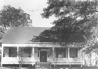 It was built as a one-story wood frame central hall plan raised plantation house with a rear wing for kitchen and dining room. It had one room on each side of the hall. It has a five-bay facade with a gallery with square posts having molded capitals. It has an entablature which is "unusually large". Greek Revival elements include transoms and side lights at the front and rear central doors. The house also has some Italianate influences: large round head panels of the front doors and "jig sawn balustrade work".[2]