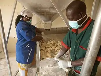 In Nigeria, cassava production is well-developed as an organized agricultural crop. It has well-established multiplication and processing techniques for food products and cattle feed.[2] There are more than 40 cassava varieties in use. Cassava is processed in many processing centres and fabricating enterprises set up in different parts of the country.[3]