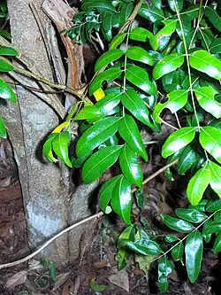 It is a small to medium-sized tree, up to 25 m tall and a stem diameter of 50 cm. The trunk is not buttressed, with grey-brown wrinkled bark. Compound leaves are alternate on the stem, with four to 16 leaflets, 2.5 to 7.5 cm long, usually opposite the leaf stem. Leaflets vary in shape, mostly lanceolate or ovate-lanceolate and broader. Leaf veins are easily noticed.
