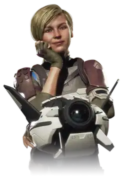 Cassie's design in Mortal Kombat 11 features her in three new outfit variations: militaristic garb, heavy white battle armor, and a hot pink visor and track jacket, respectively.[11] A Harley Quinn skin was later released as downloadable content.[18] Cassie is accompanied by the combat drone BLB-118, but no longer has her baton from MKX.[11]