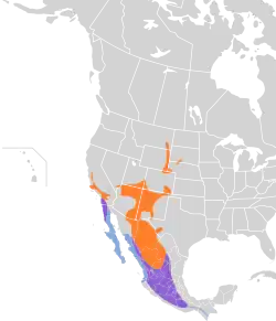 These birds migrate to their winter quarters between Southern California and northern Central America. They are permanent residents in south-central Mexico, and their main wintering ranges are west of the Gulf of California on Baja California Sur, and east of the sea on the mainland of western Mexico.