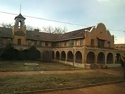 The Castañeda was designed by Pasadena architect Frederick Roehrig and was the first example of Mission Revival architecture in New Mexico,[11] as well as the first Mission-style Harvey house. As such, it served as a prototype for later buildings constructed by the Santa Fe Railway, like the Alvarado Hotel. The Castañeda is a two-story, U-shaped brick building surrounding a central courtyard that opens onto the railroad tracks. A 500-foot (150 m) long arcade wraps around the front and sides of the hotel.[4] The two side wings terminate in curved, Mission-style gables, and there is a tall bell tower above the main entrance.