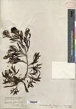 C. guadalupensis was first found by Edward Palmer on the middle of Guadalupe in 1875, although the plants were initially recognized as Castilleja foliolosa.[2][3] The type specimen was later collected by ornithologist Alfred Webster Anthony on a March 1897 expedition to Guadalupe with Townshend Stith Brandegee.[2] A year later in 1898, sailor and hunter Harry Drent collected some specimens of C. guadalupensis. The species has not been found since and is presumably extinct due to the overgrazing of the island by introduced feral goats.[2][4]