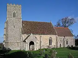 There has been a church in Castle Camps since at least the start of the 12th century. The present parish church, dedicated to All Saints since the 15th century, comprises a chancel, nave with south porch, and west tower. Situated to the north-west of the castle, the building largely dates from the 15th and 16th century, though elements of the chancel walls may have been built in the 14th century.[3]