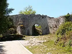 An interior courtyard, also ovular, encircled the old town, creating a second defensive perimeter, while in the east and south, the granite cliffs completed the defensive lines.[1] Here there are visible remains of homes and cubical-spaces, some with barbicans. This defensive zone is served by Fonte Vedra Gate to the south (a Roman arch doorway), while in the east is the principal entrance with access to Lavandeira, referred to as the Porta da Vila Gate.[1] To the west are the São João and the São Francisco Gates, with their own stone roads that converge at the town centre.