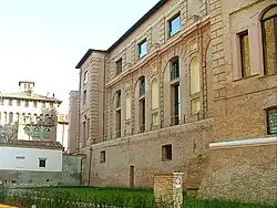 The largest surviving original structure of the castle of the Pico family is made up of the remains of the Duke's Palace, which overlooks the southern side of the castle, in front of the Teatro Nuovo. In the past, in this widening of the Costituente square, was organized the market of the horses.[18] The facade is characterized by a noble portico resting on ten columns of pink marble, made on behalf of Alexander I Pico. From the portico, through an arched door profiled in ashlar, is the entrance to the inner courtyard and the "Galleria Nuova". On the western part the building there are the remains of the sixteenth-century "bastion of the castle", reinforced in 1576 by Fulvia da Correggio[19] and connected to the mighty walls with a starry plan with 8 points that defended the city.