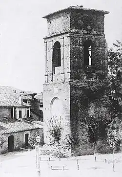 At the beginning of the 20th century, around the 1930s,[8] the city council attempted to rebuild the ancient keep of the castle (destroyed by fire in 1714), creating a massive neo-Gothic tower overlooking on the main square.[6] The modern tower is characterized by dovetail merlons, typical of the pro-Imperial faction of the Ghibellines.
