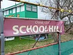 Opened during strike action taken by employees of Bus Vannin during 2012, this temporary station was located approximately three-quarters of a mile to the south-west of the station and was used only by local school children attending Castle Rushen High School; it consisted of temporary scaffolding platform with a capacity for five carriages, and operated only when the buses were on strike, at which times special trains replaced the bus service. It was located close to the start-finish line of the Southern 100 circuit and was removed after a considerable time out of use in April 2014. This was the first "new" station on the line since the halt serving Lough Ned Country Park (between Douglas and Port Soderick) was established in 1979; this however was closed in 1986 upon the demise of the park. School Hill was fitted with a vinyl banner as a station running-in board in the current house style, featuring bilingual titling. When in operation the halt was staffed by a station attendant and control of it was via internal radio communication with the station. It was also used during two of the railway's Rush Hour events when a recreation Manx Northern Railway train consisting of M.N.Ry. No.4 Caledonia and The Foxdale Coach briefly stopped there for photographic opportunities. Today there is no trace of the temporary on the site.