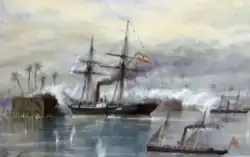 After departing Venezuela, Méndez Núñez stopped at San Juan, Puerto Rico, and Santo Domingo before arriving at Santiago de Cuba on the southeastern coast of Cuba, where Isabel II took on coal and dropped off a schooner captured in Santo Domingo.[4] Receiving word that the Dominican Restoration War had broken out on Santo Domingo, he brought 650 Spanish Army troops, a battery of horse artillery, mules, and 19 horses and put to sea.[4] Isabel II arrived at Puerto Plata on the moonless evening of 27 August 1863, where a maritime pilot informed Méndez Núñez that 200 Spaniards were holding out in a fort under siege by 2,000 rebels who planned to attack at dawn.[4] Isabel II picked her way through uncharted shallows, anchored at 22:00, and completed disembarkation of the troops at 01:30 on 28 August.[4] The Spaniards attacked the rebels at 02:00, taking them completely by surprise and quickly scattering them, relieving the fort.[4]