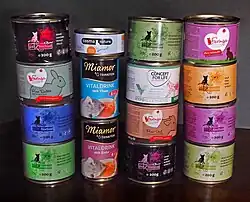 Raw feeding is providing uncooked ingredients to cats.[51] Most of the diet will consist of animal-based ingredients, though fruits, vegetables and supplements are often added.[51] Commercial raw food is mainly sold in three formats: fresh, frozen and freeze-dried.[51] Thawing and rehydration are necessary before feeding frozen and freeze-dried food respectively. Many available commercial diets are AAFCO certified in meeting the nutrient requirements of the cat.[51] Some diets may be formulated for all life stages or they can also be AAFCO certified for adult maintenance or growth and gestation/lactation.[51] Many people feed their cats raw food believing that it mimics the prey diet that wild cats would consume. Firm believers report that such a diet can bring about many health benefits, such as a shinier coat, cleaner teeth and an improved immunity to various gastrointestinal ailments (with diarrhea and constipation being the most common), as well as an increase in energy and a decrease in bodily waste odours, although no scientific evidence exists to prove these claims.[51] In addition, raw food comes at risk of malnutrition (by inexpert formulation) and infection (to the cat and other family members).[52]