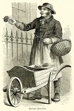 During the 19th century and early 20th centuries, meat for cats and dogs in London, frequently horse meat, was sold from barrows (hand–carts) by traders known as Cats' Meat Men or Women.[1][2] Henry Mayhew estimated in London Labour and the London Poor (1851) that the total number of cats in London might be 300,000.[3] Each cats' meat seller had a particular route and served a few hundred households, their approach marked by mewing cats.[4][5][6]