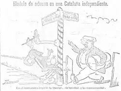 Caricature published in Heraldo de Madrid on December 2, 1918, by Tovar, entitled "Modelo de aduana en una Cataluña independiente." (in English: "Model of customs in an independent Catalonia.").