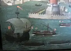 Towards the 16th century there is news of a single deck tartane with three small masts in Provence (France).[30] Regarding its military use, one of the first mentions of the tartane in the 17th century is found in the 1614 book, Pantero-Pantera "el Armata Navale", where there is an explanation of the maneuvers of the tartanes of the French navy.[31]