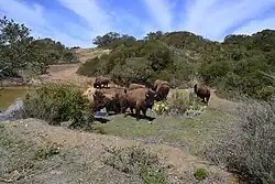 The Catalina Island bison herd is a small group of introduced American bison living on Catalina Island off the coast of Southern California. In 1924, several bison were acquired for a film shoot and, before the end of 1925, brought to Catalina. The bison are now quite popular with the tourists. Some buildings have been painted with images of bison and decorated with bison weather vanes. Over the decades, the bison herd numbered as many as 600. The population currently numbers approximately 100.[1]