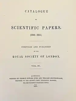 The Catalogue of Scientific Papers was an attempt by the Royal Society of London to catalogue all papers published in scientific periodicals back to the year 1800 and produce a bibliographic index organised by author.[1][2] The first volume was published in 1867 and it ran until 1901. From 1902 it was continued in an expanded form as the International Catalogue of Scientific Literature.[3][4]