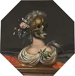 The worldview behind vanitas paintings was a Christian understanding of the world as a temporary place of fleeting pleasures and sorrows from which mankind could only escape through the sacrifice and resurrection of Christ. A wheat stalk symbolises, for instance, the resurrection of Christ on which, according to the Christian faith, the salvation of each human being depends. While most of these symbols reference earthly existence (books, scientific instruments, etc.) or the transience of life and death (skulls, soap bubbles) some symbols used in the vanitas paintings carry a dual meaning: the rose refers as much to the brevity of life as it is a symbol of the resurrection of Christ and thus eternal life.[14] Catarina's composition Vanitas bust of a lady with a crown of flowers on a ledge (signed and dated on the ledge: Catharina van ÿkens . filia Devota f. 1688, at Sotheby's London of 6 July 2017, lot 115) contains the typical symbols present in vanitas paintings such as a skull and wilting flowers, but has a distinctive macabre aspect by putting the skull crowned with a wig on a bust and having a bird pick at some berries on a branch pinned to the front of the bust.[15]