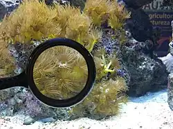 Marine aquariums: The large aquarium is located in the center of the visitors' circulation space. It contains live specimens of tropical fish and invertebrates such as the clownfish. Around the aquarium magnifying glasses are provided for visitors to observe the animals in more detail. The small aquarium has fewer species and is next to the "Do Veneno ao Remédio" ("From Poison to Medicine") area. This aquarium features a moray eel, a lionfish (poisonous specimen), among others.[15]