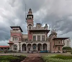 Erected by the office of Ramos de Azevedo, also in charge of the Municipal Theater, the palace displays an imported metal structure in its main structure. It has exposed brick as the main finish and has numerous decorative elements, some linked to livestock farming, such as bulls, and others not, such as dogs, and arrowheads on various ridges of the wall, a garden surrounding the main building and annexes, and the three floors of the building that occupy the center of the site: basement, first floor and upper floor. The responsible architect was Domiziano Rossi.[11]