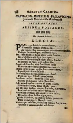 Like many members of the academy who adopted “pastoral” pen names, Caterina had the pastoral name Arsinda Poliades.[4] She was considered a full member of the Arcadian society and had work published in (at least) the 1721 edition of the society's publication, Arcadum Carmina. This edition was also reprinted in 1757.[5] Though many women belonged to the academy throughout its approximately 200-year history,[6] of the thirty-three authors present in the 1721 book of poems, Caterina is the only female author to appear. Her work also differs from the work by male authors in the collection because she is one of only six authors to write epigrams. The longer elegy and eclogue (pastoral) formats are much more popular among her male counterparts. Here is an epigram written by her: