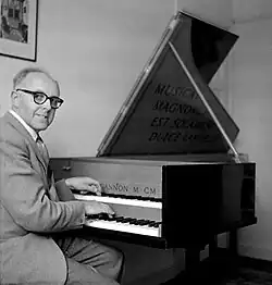 In London with Margaret, who was visiting her parents, Gannon went to the Benton Fletcher collection of keyboard instruments, which was then in Chelsea, and measured a harpsichord by Jacob and Abraham Kirckman (1777).[15] Back home, he made a copy of the instrument in a tiny conservatory at the back of his house in the Dublin suburb of Rialto.[16] The harpsichord was played by John S. Beckett for the first time in public in 1959 as the continuo for Bach's Saint Matthew Passion and was praised in the national press.[17][18] Beckett subsequently persuaded the authorities in the Guinness Brewery to provide Gannon with a special workshop, in which he made five harpsichords and restored several antique pianos.[19][20] The first harpsichord made in the Brewery was donated to the Royal Irish Academy of Music in Dublin,[21][22][23][24] The second was sold to Harrods of London,[25] and the third was sold to Ireland's national radio and television station RTÉ.[26] This third instrument was used regularly by the RTÉ Symphony and Concert orchestras and also by the well-known composer and performer of Irish traditional music, Seán Ó Riada.[27]
