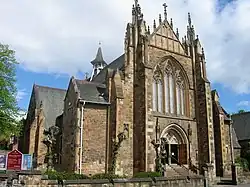 The church includes an elaborate pinnacled buttressed front, that includes a central window with Art Nouveau stained glass above the centre door. A ventilator tower was also added to the slated roof.[3]