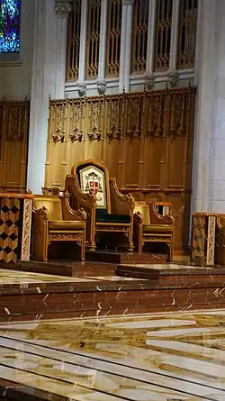 The cathedra of the Bishop of Hamilton atop a marble altar. The altar was added in 1981 during renovations.