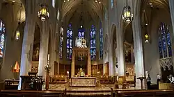 The choir loft houses a large, four manual Steinmeyer pipe organ built in Ottengen, Bavaria with almost 5,000 pipes. Robert Corso is the organist and director of music at the cathedral basilica. The organ contains 84 ranks of pipes divided with sections in the chancel and gallery. The tone of the organ ranges from a very deep profound bass, with many large wooden pipes, to a very brilliant sound with 14 ranks of mixtures on the Great, [main] manual alone, containing pipes with a high tin content, adding to the overall brilliance of sound. One of the features of the choir manual [bottom keyboard] is a set of pipes made entirely of copper, named Copper Gedect. The large scale facade pipes consisting of the pedal Diapason 16' and the Great manual's Diapason 16' are constructed of zinc. In 1981 the chancel organ was moved further north to allow more space in the sanctuary. In 1990, a new four manual console was added by R. A Denton & Son of Hamilton, built by R.A Colby, Johnson City, Tennessee, temporarily used by the Mormon Tabernacle during their organ console rebuild in the late 1980s. The four manuals are named from top to bottom: Antiphonal/Echo, Swell, Great and Choir. The new console has solid state multiple memory banks for selecting different combinations of stops rapidly. The organ also contains two stops which are tuned sharp and flat to achieve a warm, rich tone. These are a Celeste on the Swell manual and an Unda Maris [wave of the sea] on the choir manual. In April 2016 a new Casavant French terraced four manual console was installed by the Casavant Freres firm of Ste. Hyacinthe, Quebec. The height of the console being quite low, allows the organist to conduct the choirs from the bench while accompanying. To rebuild the organ today in 2016 would most likely cost approximately $5 million Canadian dollars. In 2017 the original console for the chancel organ was rebuilt by Casavant Freres. They also worked to restore the organ itself.
