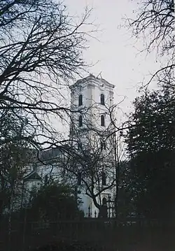However, the present character of the religion in Hajdúdorog started to take shape after the settlement of the Hajduks in the 17th century. According to the diploma of Korpona, issued by prince Stephen Bocskay in 1605 and reassured by palatine György Thurzó in 1616, Dorog along with other towns in the region became the possession of the Hajduks. The prince also granted them titles of nobility as a reward for their help in the wars against the Turks.[6] The new owners of Dorog were all warriors and Orthodox Christians, but according to the palatine's list, most of them had Hungarian names. The Hajduks finally settled to Dorog in 1616. The first notes about the settlement's Byzantine rite community are from 1638. Bazil Taraszovics, bishop of Munkács appointed Dorog's priest, Radivoj Marinics, archdeacon. The remarkable position refers to the strength and prestige of the community.[7] The Hajduks started to build a small fort in the center of the town. To defend the fort, they also constructed a brick watchtower. The tower was finished by 1640, and now it serves as the lower part of the cathedral's bell tower. Within the walls of Hajdúdorog, close to the watchtower, stood the remains of the old stone church. A number of Romanians fled to the newly established town to escape from the Turkish troops. The Byzantine community was soon split to two parishes: one parish served in Romanian language and the other in Church Slavonic (Hungarian wasn't a liturgical language in Eastern Orthodoxy, so it couldn't be used).[8][9][7] The two parishes agreed in the use of the church building in 1667.[10] The fort, the stone church and the watchtower were seriously damaged during the wars of the 17th century. In 1742 the tower was rebuilt close to the medieval church, and it reached the height of 24 m (78.7 ft.).[7]