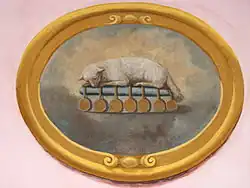 The secco of the Agnus Dei was painted on the apse, to the most emphasized place, in front of the altar table. The lamb, symbolizing Jesus, is reposing on the Book of the Seven Seals known from the Book of Revelation. The priests, standing and praying at the altar table, are facing this mural. The lamb symbolizes the good shepherd, which is the duty of the priests; and it refers to the revelation too, reminding the priests to the importance of the strong faith.[12]