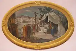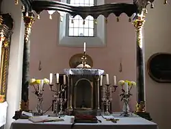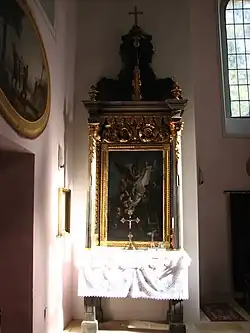 The side altar, also known as prothesis, is traditionally situated on the northern part of the sanctuary in the Byzantine rite churches. Priests prepare the bread and the wine on this smaller altar table for the holy liturgy. In the Cathedral of Hajdúdorog the prothesis was part of the original, early 19th century furniture made by Miklós Jankovits. It didn't go through major changes, like the main altar did. The parts above the altar table are original carvings.[32] The table itself was changed probably in the 1870s. The arched volutes on the top of the prothesis are part of the original, Baroque structure. Two Corinthian columns hold the top structure of the prothesis, and they frame the painting of the side altar. The Descent from the Cross was painted by György Révész, approximately in 1870. He copied the composition of Rembrandt's 1634 master piece. The prothesis is ornated with typical Jankovits motifs. The gilded festoons, rose heads and acanthus leaves appear on the iconostasis and on other furniture too. The prothesis was over-painted with white oil paint during the Latinizing 1937 renovations. It was restored in 2005.[33]