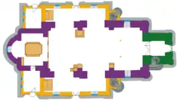 The cathedral has a longitudinal plan with a long nave in the middle. All of the major extensions of the building can be easily connected to an architectural style. The different width of the walls refers to the age, when a particular part of the cathedral was constructed. The foundation of the bell tower is the oldest part of the present day basilica, and it has 190 cm (6.23 ft.) wide walls. The main nave and the apse were added next in the baroque period. The walls here range between 135 and 162 cm (4.43–5.31 ft.) width. The youngest attachments to the cathedral were the aisles in the 19th century. They have the thinnest walls measuring "only" 80 cm (2.26 ft.).[18]