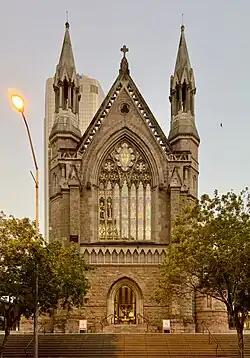 The cathedral, named for the first century martyr Saint Stephen, is located on a site bounded by Elizabeth, Charlotte, Creek, and Edward Streets, in the Australian city of Brisbane, Queensland. James Quinn, the first bishop of Brisbane, arrived in 1861 from Ireland, and soon planned to build a large cathedral to accommodate a growing congregation. On 26 December 1863, the Feast of Saint Stephen, Quinn laid the foundation stone for a grand cathedral designed by Benjamin Backhouse, but this did not at first proceed beyond the foundations. R George Suter was then commissioned to design a smaller, simpler church partly on the foundations, and the current nave was built 1870–74, with the front gables and spires completed 1884.[2] No further was undertaken until James Duhig took up the archbishopric in 1917. With plans to build new larger Holy Name Cathedral in Fortitude Valley, he engaged architects Hennessy, Hennessy & Co to complete St Stephen's with a crossing, transepts and sanctuary in a simpler design than intended, which was built in 1920–22.