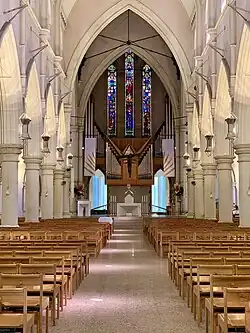 St Stephen's is a gothic revival cathedral with a cruciform shape in plan. While this is a plain cathedral by comparison it still has a selection of striking features such as the spire topped sandstone towers, imported stained glass windows from Munich, the organ, the altar and the newer Blessed Sacrament Chapel at the rear of the building. Of particular note is the stained glass window by Harry Clarke, known as the "Mayne" window, which is located above the sanctuary on the east wall. The cathedral is made predominantly of Brisbane tuff and freestone. The Blessed Sacrament Chapel is made from reinforced concrete and the restored spires from glass reinforced concrete.[2]