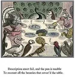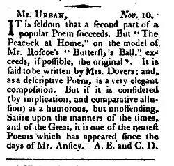 Catherine Ann's sister, Charlotte, was more well-known until 1807 when Catherine Ann published a story that both entertained and educated. It was titled The Peacock 'at Home': A sequel to the Butterfly's Ball. The Peacock 'at Home' gently satirized the social flaws of aristocracy and the upper-middle class, as well as teaching children about birds in an enjoyable way.[4] The Peacock 'at Home' was originally anonymously published as "by A Lady". The poem was written in cheerful rhyming verses. The book was illustrated by the Irish painter William Mulready and was seen as a sequel to The Butterfly's Ball, and the Grasshopper's Feast by William Roscoe.[2] The Peacock 'at Home' was a sequel to William Roscoe's book, but some felt that it was better than the original. The Peacock 'at Home' sold 40,000 copies as part of John Harris's Cabinet series. There were discussions about her poems in The Gentleman's Magazine: some applauded the piece, saying it was refreshing to see a sequel that actually surpassed the book that preceded it; others made comments on the fact that it was published by a woman and if she was looking for recognition, she should go to a tea party.[5][6] Nonetheless, the series was extended and Catherine Ann contributed Think before you Speak, or, The Three Wishes and maybe another title too. Think before you Speak, or, The Three Wishes was based on a translation of a traditional French poem.[3]