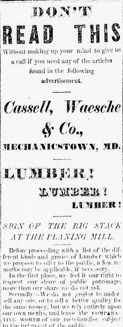On August 1, 1879, Alexander Beatty sold the paper to Charles E. Cassell and Edgar L.[1] Root, admitting in the October 30, 1879 issue that though "neither are practical printers," Cassell and Root were "well known both in social as well as in political circles" and would "leave nothing undone to make it one of the spiciest and best country papers in the State."[8] Cassell and Root admit their inexperience again in their salutatory in the same issue, writing, "Although we are not tyros in the profession, yet...our determination to win, aided by an unsparing and intelligent criticism, may reasonably be expected to bear their fruit in due season."[9] This promise ended up being fulfilled: as editor, Cassell became more active in local politics and continued to chronicle the economic growth of Mechanicstown.[10][11] One of his most permanent legacies involved the change of the town's name from Mechanicstown to Thurmont in 1894.[12]