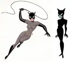 - First appearing in Batman: The Animated Series (1992), her design took inspiration from Michelle Pfeiffer's portrayal, with long blonde hair in her civilian identity and a predominately gray catsuit with long black gloves and boots, causing her to resemble a seal-point Siamese cat. Furthermore, this series establishes Catwoman as a socialite and animal rights activist in addition to being a costumed thief in her early appearances and highlights her feelings towards Batman. Though she displays a crush on him, she tries to keep her distance from Batman and Bruce Wayne, who she previously dated.