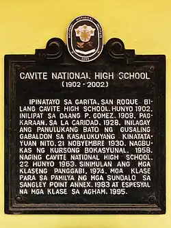 Cavite National High School (Filipino: Pambansang Mataas na Paaralan ng Cavite) formerly known as Cavite High School (Filipino: Mataas na Paaralan ng Cavite) is a Secondary school located at the City of Cavite in the Philippines. It was established on June 19, 1902, and it is the first and oldest national secondary school in the Philippines.