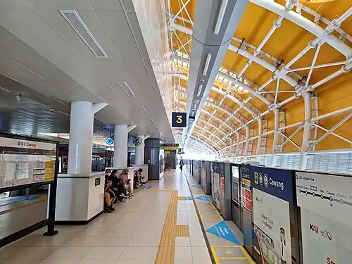 Cawang LRT Station is a light rail station located in Jalan Letjen M.T. Haryono, Cawang, Kramat Jati, East Jakarta. The station, which is located at an altitude of +39 meters, serves the Cibubur and Bekasi lines of the Jabodebek LRT system. It is the main interchange station between the two lines of the system where the two lines meet and split.[1] It is the only station in the system with two island platforms instead of two side platforms, hence the only one with four tracks. Despite sharing the same name, this station is not to be confused with the unrelated Cawang railway station served by the KRL Commuterline on the Bogor Line. Instead, Cawang KRL station is interchanged by the Cikoko LRT station.