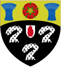Sable three swans' heads erased Argent guttee de poix a chief arched Or thereon a rose Gules barbed and seeded Proper between two garbs Azure.