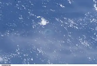 The atoll is the only island of the archipelago to have a circular shape, its diameter in the east-west direction being approximately 8 km.[7] In the same direction, it consists of a windward pre-reef terrace, a lagoon, a lagoon terrace and a leeward pre-reef terrace.
