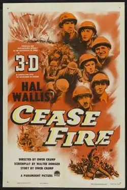 Cease Fire! is an American 1953 war movie directed by Owen Crump. The film featured real ammunition and real soldiers that were filmed on location in Korea, and was the first 3D war movie filmed in an actual theatre of operations.[2]