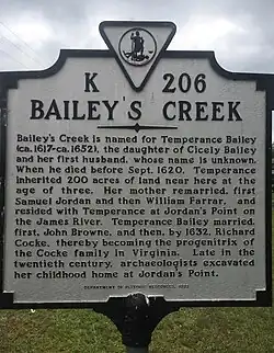 In the Jamestown Muster of 1624-1625, the list of Cecily and William Farrar's household members includes Temperance Baley (now spelled Bailey), who was listed as seven years old and born in Virginia.[3] Temperance is listed as receiving a patent for 100 acres in 1620 when she was about two or three years of age; she is also listed as having 200 acres planted in 1625.[5]: 102 Samuel Jordan's 1620 patent lists her properties as adjoining his.[9] Based on this evidence, several researchers have concluded that Temperance may be Cecily's daughter from a previous husband named Baley.[22][18][23][5]: 434 However, there is no direct documentation that she is Temperance's mother or that she had a husband before marrying Samuel Jordan.[2] In addition, Temperance's father has not been conclusively identified.[22]