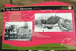 The first ice house in Cedar Falls was built in 1858 near the homestead of William Sturgis, the first permanent resident of Black Hawk County.[2] It was destroyed in a fire on October 22, 1921. Hugh Smith, who owned Cedar Falls Ice and Fuel Company, made plans for the present structure. It was completed in November 1921 by the Cedar Falls Construction Company.[3] The first ice harvest began on January 10, 1922. The building served as an ice house from 1922 until Smith lost his business in 1934. Cedar Falls Trust and Savings Bank took over the building. It was used as a livestock barn and later was flooded for ice skating. In 1938 the city of Cedar Falls purchased the building and leased it to the Cedar Falls Boat Club. They occupied the building until 1976 when the building was condemned. That year the Cedar Falls Historical Society decided to save the structure. After a successful fund-raising campaign the building was renovated beginning in 1978, and the Ice House Museum opened on June 24, 1979.[2] The building was damaged in a 2008 flood.